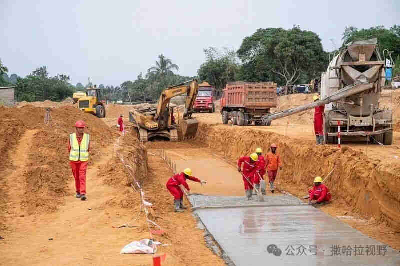 在刚果(布)黑角市近郊的道路上,推土机轰鸣,卡车往来穿梭,沟槽中焊花闪烁,当地工人和中国工程师正在并肩作业。