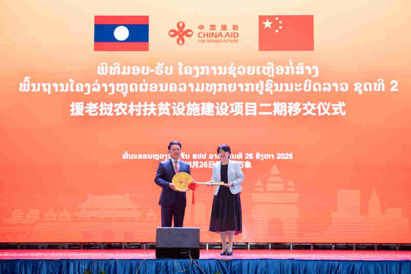 8月26日,我驻老挝大使方虹代表中国政府向老挝政府副总理沙伦赛正式移交中国援老挝农村扶贫设施建设项目二期。中老政府和企业代表约150人参加移交仪式。