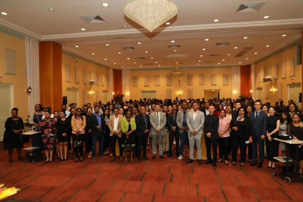 2024年1月24日晚,驻苏里南使馆举办援外培训学员联谊会。中国驻苏大使韩镜、苏农牧渔业部常秘拉姆基森辛出席并致辞。苏外交部、自然资源部高级官员、2023赴华参加培训和考察的苏政府、议会、政党、有关机构和媒体代表等200余人参加。