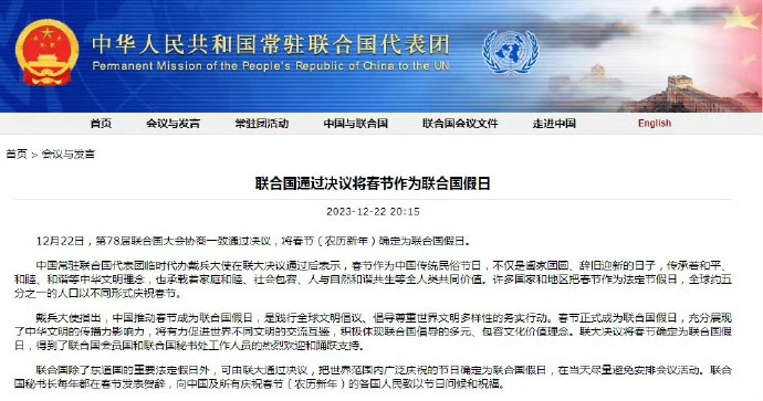 第78届联合国大会22日协商一致通过决议,将春节(农历新年)确定为联合国假日。